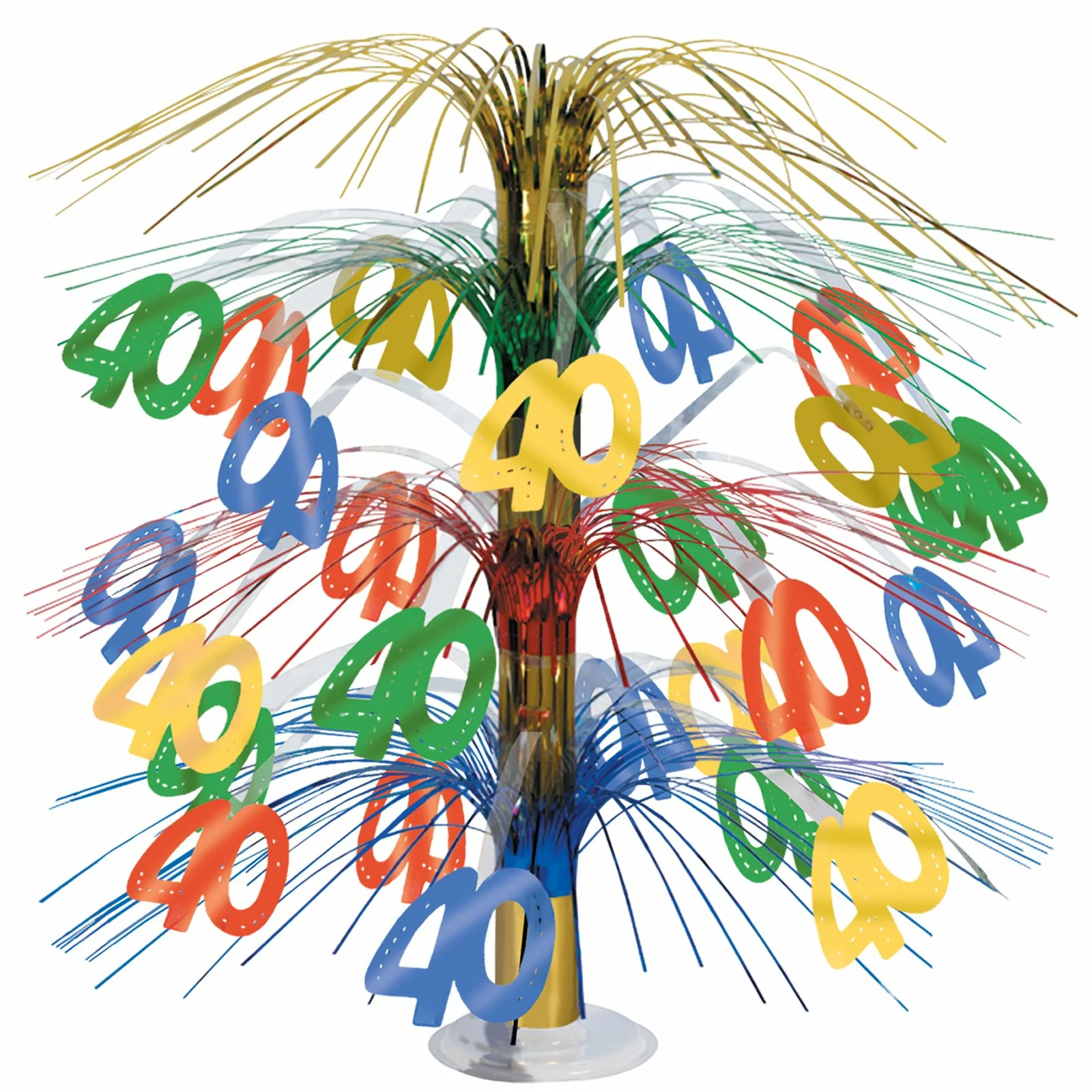 This “40” Multi Color Cascade Centerpiece features foil fringe and multi-colored plastic number cutouts. Measures 18″ high. Made of foil and plastic. Look for additional “40” party items (sold separately).