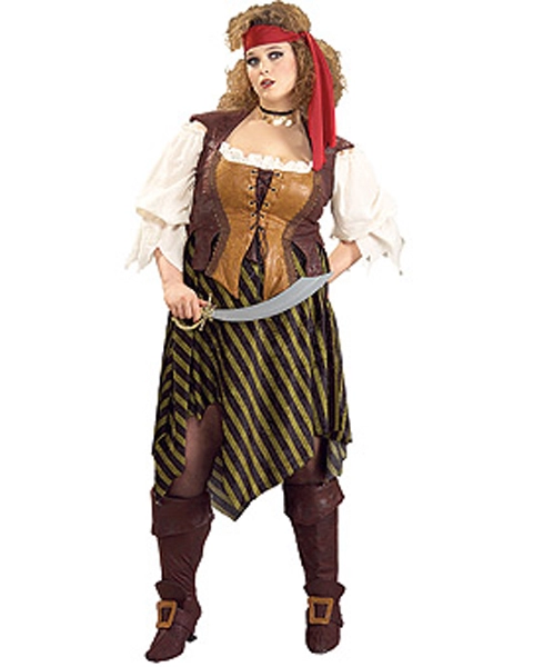 Pirates loved them, what more could anyone ever wish for? Danger snapped at the heels of pirates, which is why it takes a special kind of lady to control one. Let someone take you on an adventure on the seven seas in this Pirate Wench Costume Adult Plus that will have all the scallywags drooling with the fire of a brown lace-up front corseted vest. The white peasant blouse adds a certain innocence to the look, reminiscent of a soft night shirt that quickly turns into an outfit for climbing the ropes to operate a ship, surprising everyone. You’ll have men sailing the seas for you, discovering new lands and naming them after you, even walking the plank for you. A flowing striped skirt will show off your sea legs nicely, leading to the perfect finishing touch; boot tops adorning only the most swashbuckling of all sirens. Pirate wenches are dangerous and fierce, but with this costume they’re also undeniably well dressed.