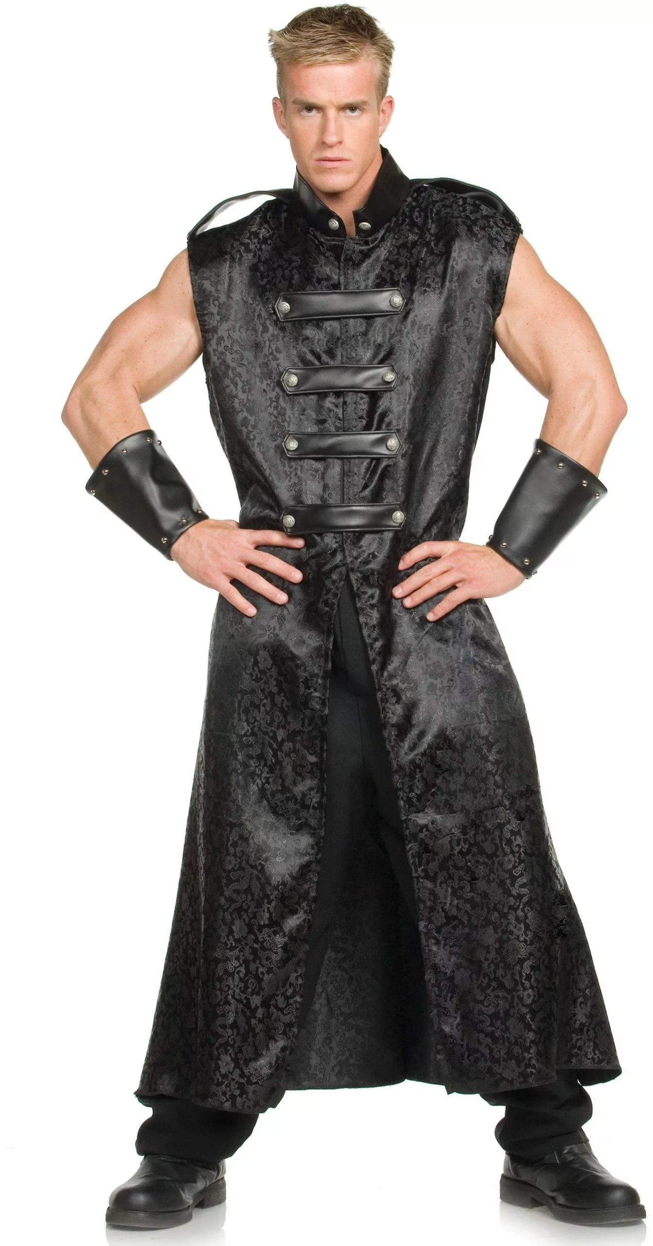 Strong, tough, agile and sexy, this guy’s got it all! The Anime Tunic Black Adult Costume includes a jacquard sleeveless full-length tunic with arm bands in a black oriental print. Velcro closure.