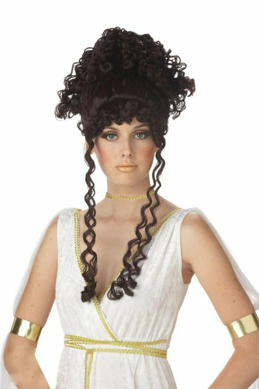 Athena, Hera, or even Aphrodite, this Brunette Athenian Wig works for any Goddess! Includes: curly brown wig set in an updo with four long curls down the front. Dress and jewelry not included. One size fits most adults.