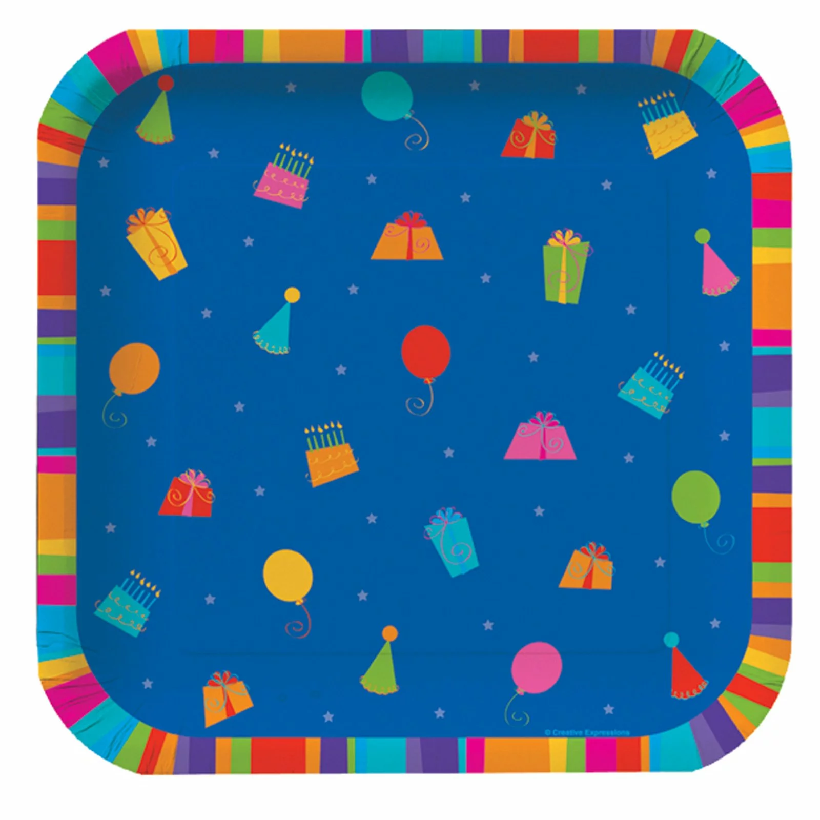 These Birthday Stripes Dessert Plates (8 count) measure approximately 7″ in diameter and feature a colorful border and a blue background with balloons, presents, cakes and hats. Look for additional Birthday Stripes napkins and cups (sold separately).