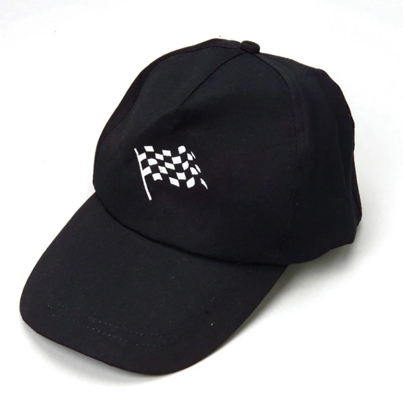 This black racing cap features a black and white checkered flag on the front and also has an adjustable strap. Cap is adjustable from 18″-23″ in circumference.