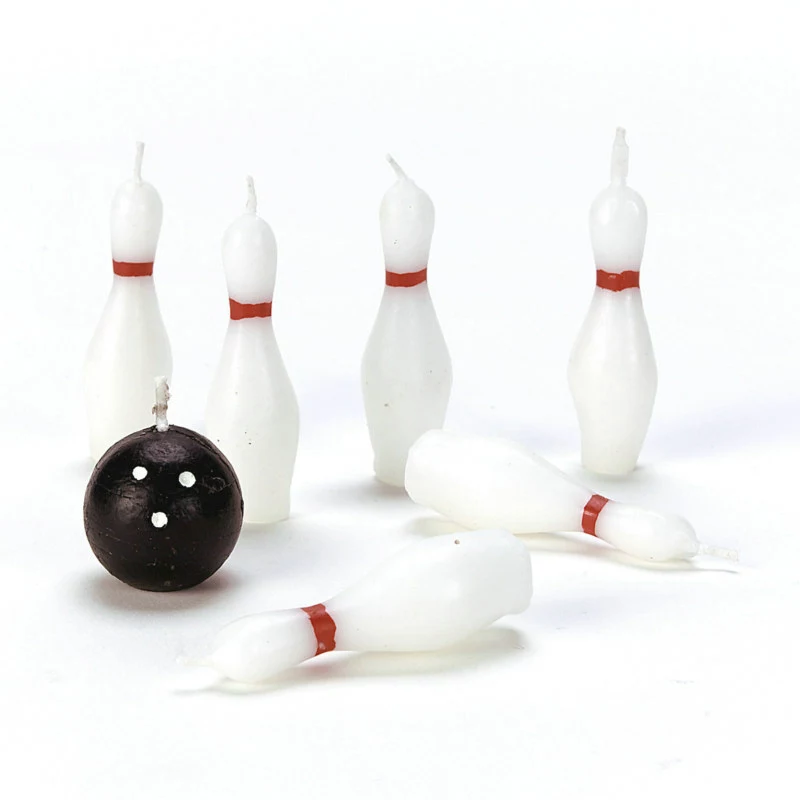 One, two, three…blow! Light up this bowling ball candle and the 6 bowling pins for a great bowling party!