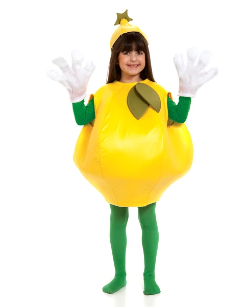 Your child will look so cute in the Child’s Lemon Unisex Costume that you’ll want to squeeze them! The Lemon Costume features an roomy yellow lemon shaped tunic with a stem hat. It is a cute costume to wear for Halloween but it can also we worn for a school play. When children are preschoolers they often put on productions that include food so they can learn about the food groups. For a little entrepreneur the lemon costume can be worn while having a Lemonade Stand. The Child’s Lemon Costume is shown with green tights and big white hand mitts which are sold here separately. If you need additional fruit and vegetable costumes, we have several in stock from which to choose. * Includes body and hat. * Mitts sold separately. Tights and body suit not included.