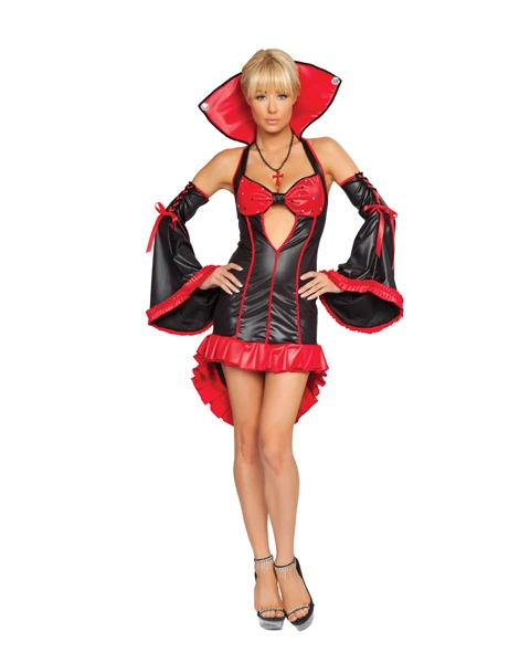 This costume will show off your body and make men dream of being bitten by your immortal kiss. When you step into the Elegant Vampire Women’s Sexy Costume you will be wearing a figure flattering dress that turns heads. The Sexy Elegant Vampire Costume features a black halter dress with a high red collar, red cups, a cut out peek-a-boo front, a ruffled hem that is short in the front and longer in the back. It also comes with a detached lace-up bell sleeves with adjustable red ribbon ties. You can add any kind of vampiress accessory to this costume such as jewelry, wigs, shoes, boots and makeup. * Includes dress with attached collar and detached lace-up bell sleeves * Necklace and shoes not included