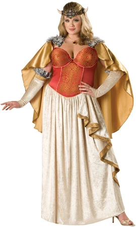 Gown with metallic screen print details and draping, headpiece, necklace, cape and fingerless gloves