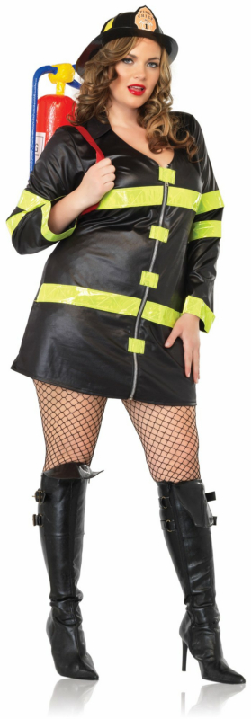 And she isn’t putting out fires! In fact, she’s making them even hotter. In this rubbery zipper front dress with firey reflective tape, she’s ready for the heat. Her gear also includes an inflatable extinguisher-for decorative purposes only.