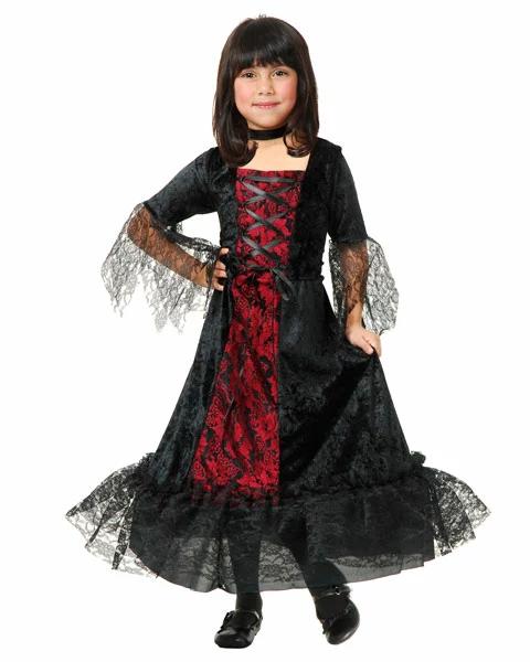 Here is a fancy vampiress dress for girls. The Girl’s Gothic Vampira Child Costume features a long red and black velvet dress with lots of black lace. The combination of black, red and lace is classic vampiress style. This costume has the lace creating sheer bell sleeves and a long flared ruffle at the hem. The front of the dress has a satin ribbon tie. The costume also includes the black satin choker. Your child can be a Gothic Vampira with lots of glamour by adding Gothic jewelry or you can accessorize it with vampire makeup and fangs to create a spooky Gothic Vampira Halloween costume.