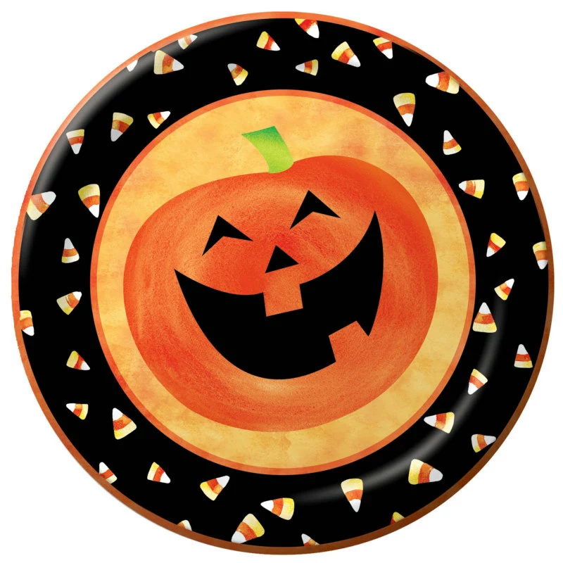 The Halloween Party 7″ Dessert Plates (25 count) are made of paper and have a smiling jack-o’-lantern surrounded by candy corn. Look for matching cups and napkins (sold separately or as a Deluxe Party Kit).