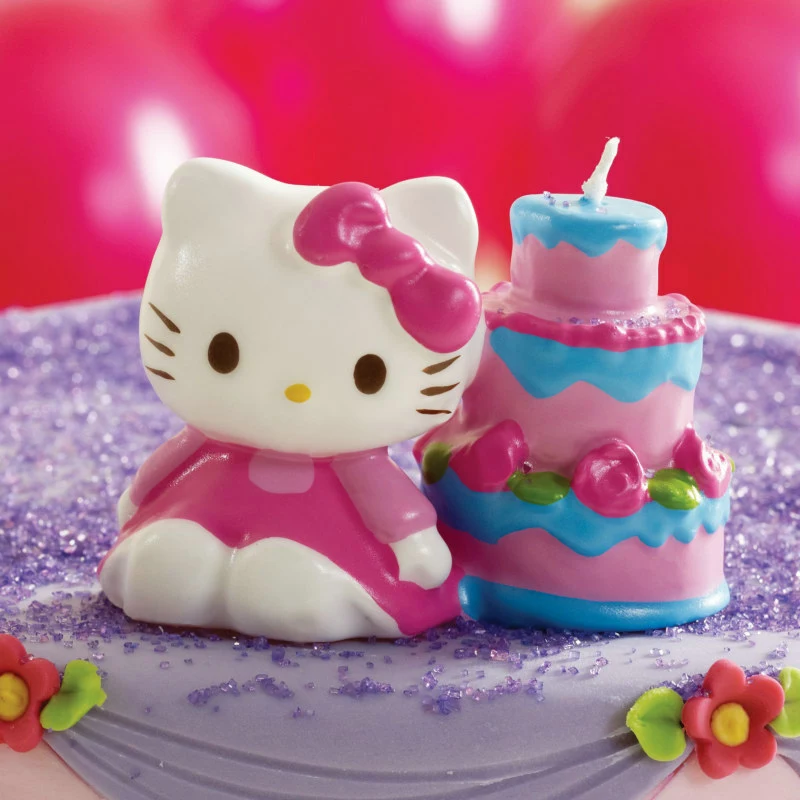 This Hello Kitty molded candle features Hello Kitty sitting next to a decorative cake. Measures approximately 2″ high x 2.5″ wide x 1″.5 deep. Caution: Do not leave candles unattended or near children or pets.