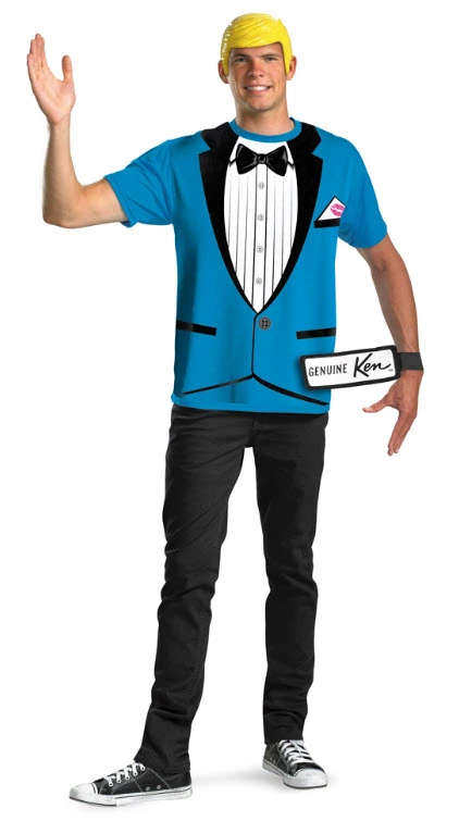 Costume includes: Printed t-shirt, plastic headpiece and “Genuine Ken” tag.