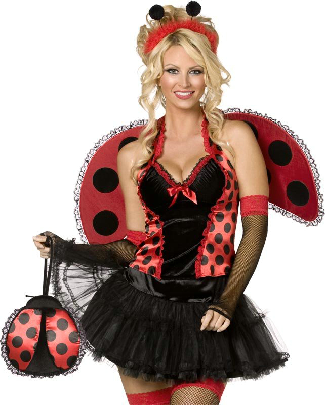 The Lovely Ladybug costume includes a polka dotted halter top that laces up the back, matching bloomers, black tulle petticoat with an elastic waist band, fishnet thigh highs and glovettes. Ladybug shoe clips, ladybug wings and antennae headband are also included to complete your aphid attire! You’ll be ready to buzz around town and bring good luck to all!