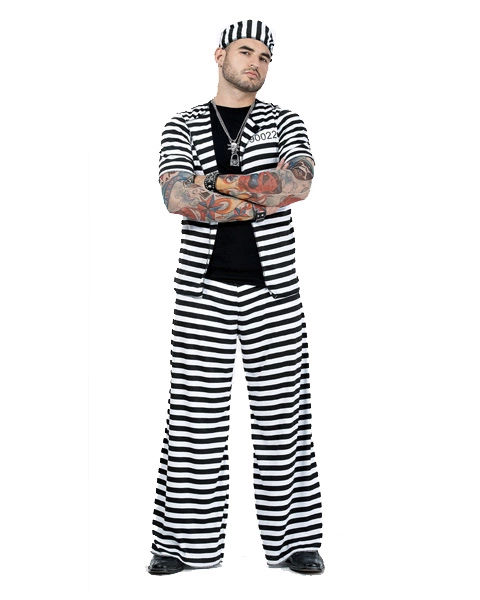 When you’re in the clink you need to be a really tough guy who doesn’t take any grief from anybody, not even the guards. If there’s one thing that makes you look really tough, besides being dressed in prison garb, its tattoos. Be the ruler of your cell block in the Adult Prison Playa Costume. The prison costume comes with traditional black and white prison shirt, pants and cap plus a pair of tattoos that will make you look like a Hell’s Angel gone crazy. * includes a shirt, pants, hat and tattoo sleeves. * Jewelry not included.