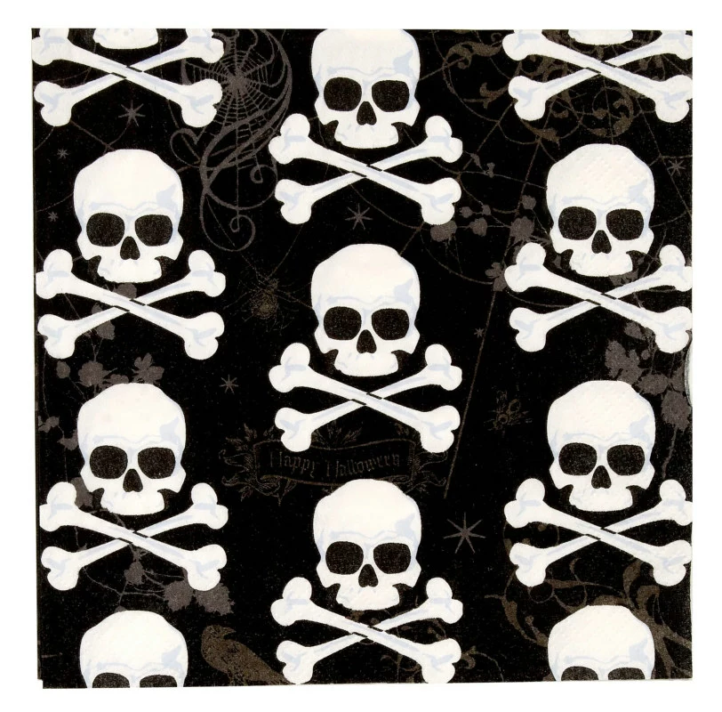 Package includes (36) black paper lunch napkins that measure approximately 6.5″ wide x 6.5″ high. There are multiple skull and crossbones printed on the napkins. Look for more spooky Halloween products (sold separately).
