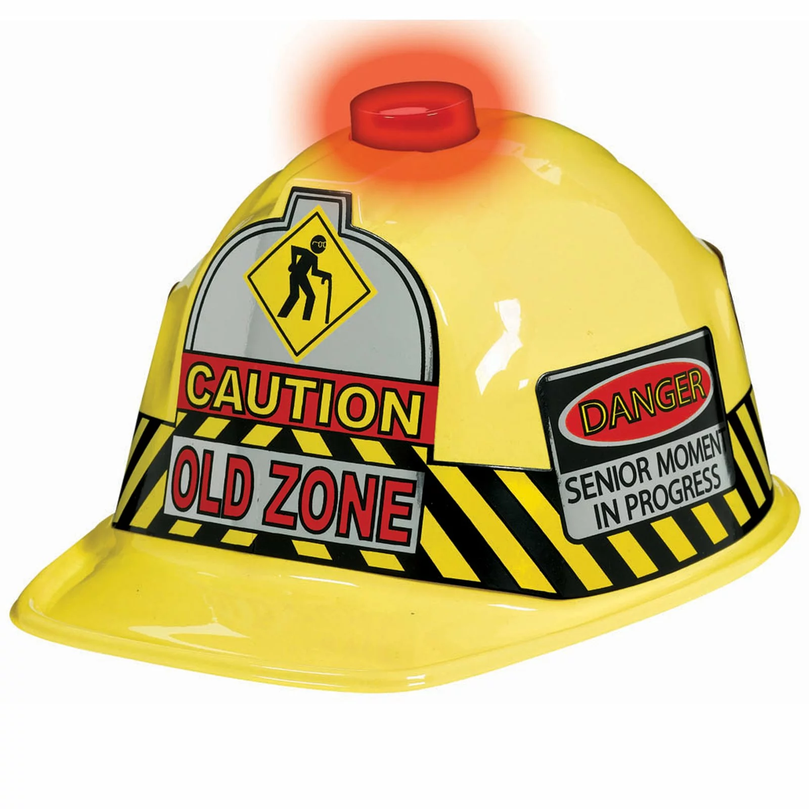 This Over the Hill “Old Zone” Flashing Hat will warn everyone about the “OLD ZONE”. Hat features a flashing red light on top and several humorous sayings. One size fits most adults. For adult novelty use only. Hat does not provide protection. Please Note: Batteries are not replaceable.