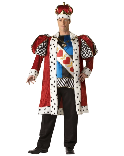 You’ll have the ace up your sleeve in our Plus Size King of Hearts Costume! This elaborately designed ensemble is perfect for stealing the heart of any lady you encounter. The costume features a large, red velvet jacket with fluffy sleeves and a faux fur trim. Gemstones run the length of the medallion necklace. The King of Heart’s tunic is sleeveless and has blue and black fabrics and a gold trim. The base of the tunic is a black and white striped and nicely compliments the faux fur trim. A royal sash hangs off of one shoulder and has large red hearts and gold stitching on its white fabric. The king’s crown is a plush red velvet piece with gold trim. At the top of the crown is a gold piece and at its bottom is a fur band in the same design as the jacket’s trim. Wear this and be assured of the royal life this Halloween!