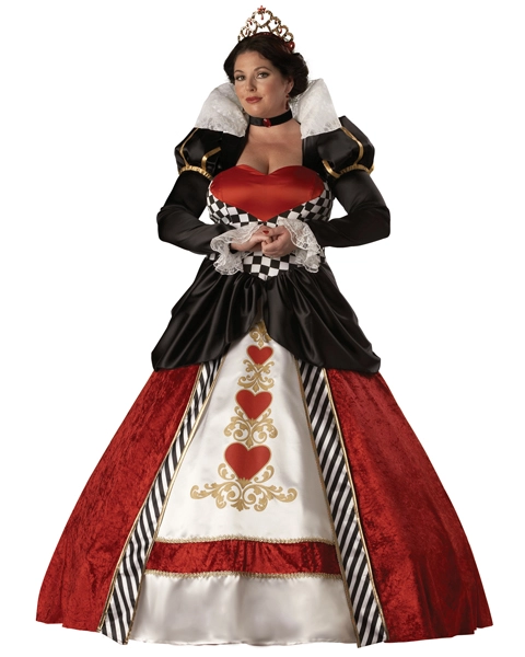 Our Elite Plus Size Queen of Hearts costume is perfect for the fairytale fan in you. You’ll love the detailed costume which includes a dress, petticoat, choker and tiara. The dress is a combination of black, white and red hues with a checkerboard pattern on its midsection and gold trim throughout. The upper is mainly black with a red, heart-shaped cut over the chest – how appropriate for the Queen of Hearts! The shoulders are flared out and almost touch the raised white collar. White lace on the cuffs matches the collar. The black satin petticoat takes up the first third of the dress’s bottom. Underneath that is a red velvet fabric divided down the middle by an elaborate design of stripes and large red hearts. Perfect for any Queen of Hearts, the black choker keeps with the color scheme and has a large red gemstone in it, and the tiara is sequined and designed in a heart pattern.