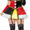 Take a little detour from grandmother’s house in this hot little number which includes a sexy garter dress with back zipper closure, corset front, gingham skirt, puffy sleeves, and a matching hooded cape. Every big bad wolf will be howlin’ for your attention!