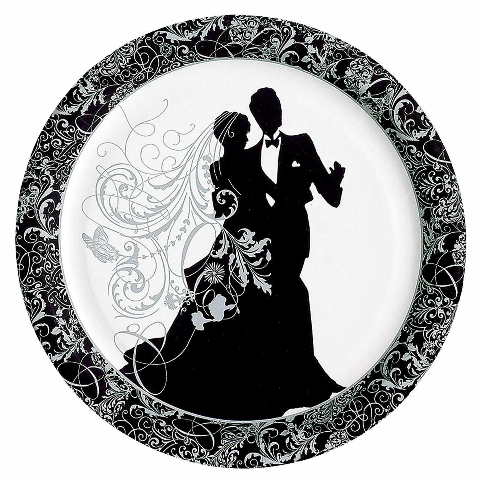 These Silhouette 10″ Banquet Plates (8 count) have a white background with a beautiful silhouette of a bride and groom in the center. Border has a silver scroll on black trim. Look for coordinating napkins and cups (sold separately).