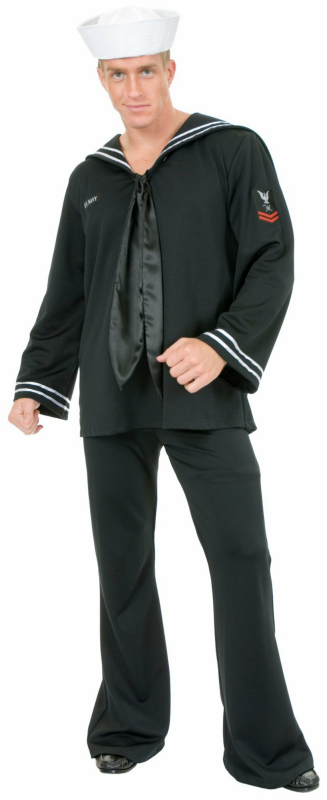 No woman can resist this rugged seaman. Show some U.S. Naval pride in the chivalrous South Sea Sailor costume, which includes a classic Navy uniform style top complete with double white stripes on the sleeves and the collar, attached naval patch on the right sleeve and U.S. Navy appliqué on the chest and attached tie. Matching pants, a white sailor’s hat and satiny bold black tie are also included in this courageous costume.